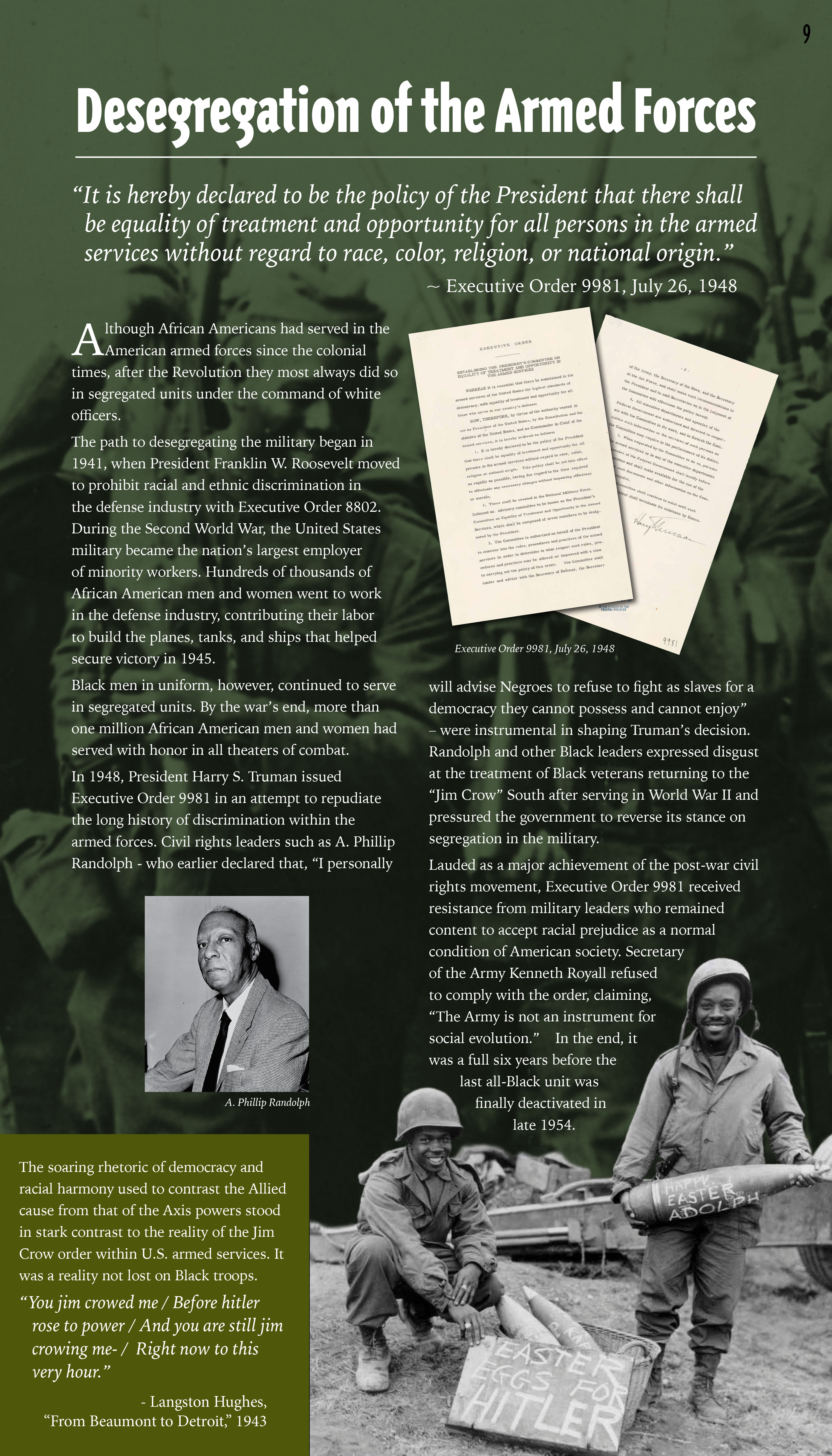 On July 26, 1948, President Truman issued his Executive Order 9981, directing “as rapidly as possible” a policy establishing "equality of treatment and opportunity for all persons in the armed services without regard to race, color, religion or national origin." The Path to Integration: African Americans in the Armed Forces examines the struggle to bring the full measure of Truman’s Order — in both spirit and practice — to reality.